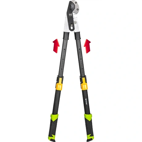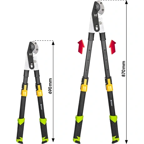- A teleszkópos kialakítás és a nagyobb vágóerő hatékonyabb, kevésbé megterhelő munkavégzést tesz lehetővé