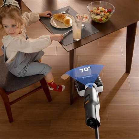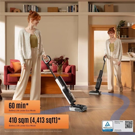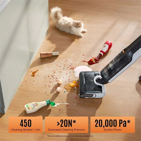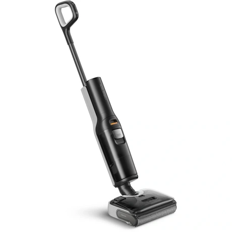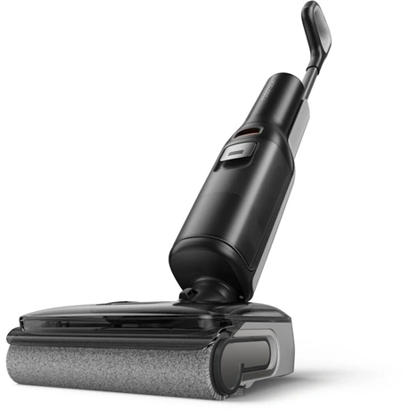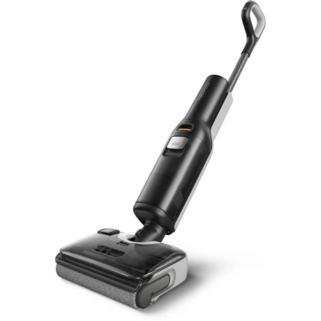 Álló porszívó – felmosóval, akkus, alkalmas minden padlótípushoz, allergiásoknak és állatszőrhöz, nedves tisztítás, Li-ion akkumulátor, működési idő 60 perc, töltési idő 4 óra, szűrőlerázó rendszer nélkül, HEPA szűrő és mosható szűrő, 200 W teljesítmény, zajszint 75 dB, műanyag gyűjtőtartály 0,72 l űrtartalommal, vezérlés a készüléken, LED kijelző és teljesítmény szabályozás, mérete 115,7 × 33 × 31,6 cm (Ma×Sz×Mé), tömege 4,2 kg, tisztító állomás a csomag része, fekete kivitel