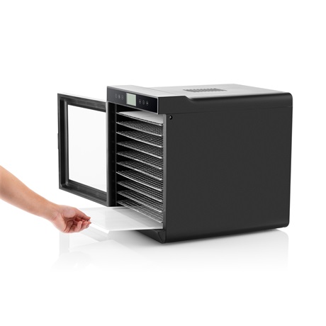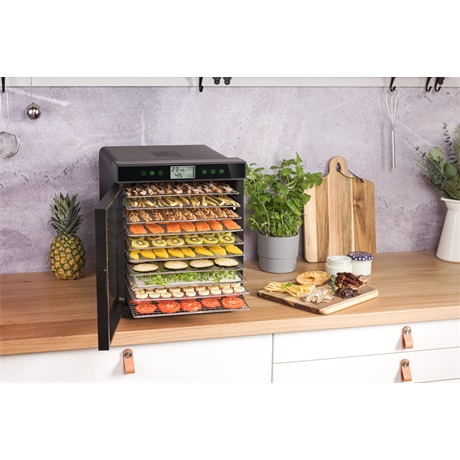 Többcélú élelmiszer-szárító egyenletes légáramlási technológiával, előre beállított programokkal és 10 rozsdamentes acél szita.