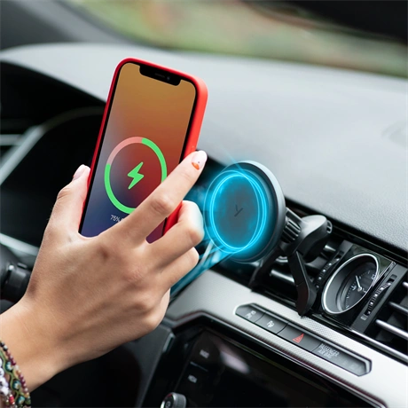 A tartó a szellőzőrácshoz rögzül, és egy erős mágnes könnyedén tartja a telefont a helyén. Többszörös védelemmel is rendelkezik a túlmelegedés, a túlfeszültség és a túláram ellen, valamint képes idegen tárgyak észlelésére.