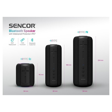 A Sencor SSS 6202 Hype S hordozható vezeték nélküli hangfal Bluetooth csatlakozással lehetővé teszi a telefonhívások kezelését is a beépített mikrofonnak köszönhetően akár 15 m hatótávolságon belül. Ha véletlen leönti vízzel, akkor az IPX7 védelem miatt nem okoz kárt a készülékben. Ha 2 Sencor SSS 6202 Hype S vezeték nélküli hangfalat sztereó rendszerbe párosíthatja a TWS (True Wireless Stereo) funkció segítségével. Mindegyik a két audio csatorna egyikét képviseli (jobb és bal).