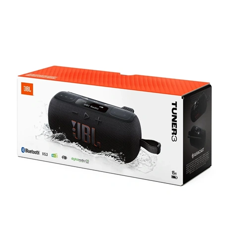 Hangolódj a mókára, és merülj el egy magával ragadó új rádióélményben! Nagy teljesítményű, hordozható JBL Tuner 3 rádiónk a kedvenc DAB/DAB+/FM rádióállomásainkra és Bluetooth streamingre hallgatható, merész, kristálytiszta JBL Pro hangzást biztosítva a konyhában, a medence mellett, a kempingben, vagy bárhol, ahová a hangulat szólít. Tudjuk, hogy ez a zenehallgatás élményét felemeli. Készülj fel a hangerő feltekerésére! Megnöveltük a teljesítményét, így a praktikus JBL Tuner 3 elég hangos ahhoz, hogy bármilyen teret tiszta, élethű hangzással töltsön meg. Ez a valaha volt legerősebb rádiónk. Állítsd be a hat kedvenc állomásodat, hogy mindig kéznél legyenek. Szeretjük felfedezni a rádióhullámokat, hogy lássuk, milyen meglepetések tartogatnak a nagy, tiszta LCD kijelzőn. Akárhogy is, akár 15 órányi zenehallgatást kapsz a Playtime Boost segítségével, mielőtt töltésre lenne szükséged. Vidd magaddal bárhová, beltéren vagy kültéren, a masszív hurok segítségével. Akár a fürdőszobai mosdókagylónál, akár egy homokos tengerparton hallgatod, a vízálló és porálló kialakítás szinte bármivel megbirkózik. Találd meg a saját új állomásodat a JBL Tuner 3-mal.