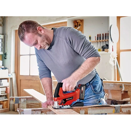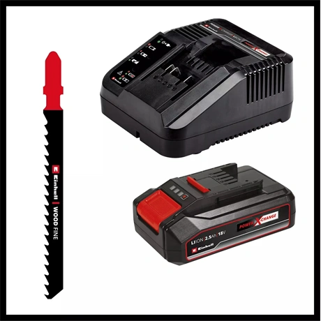 Az Einhell TC-JS 18/70 Li (1x 2,5 Ah) akkumulátoros dekopírfűrész nélkülözhetetlen segítség, bármilyen anyagot kelljen is elvágnia. A Power X-Change termékcsalád tagjaként kivételes rugalmasságot biztosít, akár az otthonában, akár a műhelyben, akár a garázsban használja. A 2700 vágás/perc alapjárati löketszám egyenletes működést, és ezáltal pontos és szép vágásképet biztosít. Fában 70 mm, acélban pedig 8 mm mély vágásokat végezhet. A vágás dőlésszöge akár 45° is lehet. A mellékelt felszakadásvédő elem mindig tökéletes végeredményt garantál. A bekapcsolható lengő előtolás gyors fűrészelést biztosít. A T-szárú fűrészlapokhoz tervezett befogó egyszerű és gyors szerszámcserét tesz lehetővé. A vágás vonalának tisztán tartásáról a fúvófunkció gondoskodik. A készülék elszívóadapteréhez csatlakoztathat még pluszban egy száraz-nedves porszívót is. Az acélból készült alaplemezen található műanyag csúszóbetét óvja a különösen érzékeny munkadarabok felületét, és megakadályozza, hogy a felület megkarcolódjon vagy elszennyeződjön. A fogantyú Softgrip borítású felületei mindig kényelmes fogást és használatot biztosítanak. A készülékhez egy darab 2,5 Ah Power-X-Change akkumulátort és egy töltőt mellékelünk. A gyári csomagolás 1x fafűrészlapot, 1x porelszívó adaptert és egy hatszögkulcsot tartalmaz.