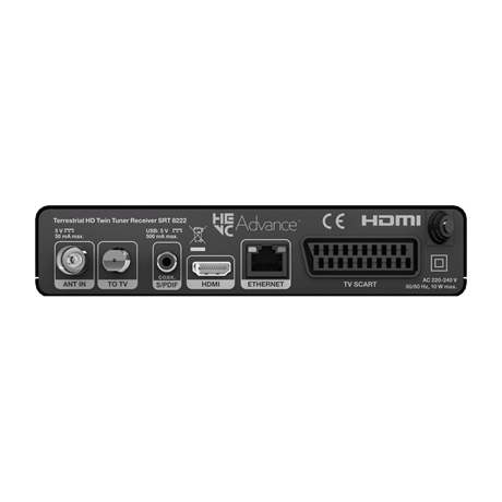 - Csatlakozók: ANT IN, TO TV, S/PDIF coaxial, HDMI, RJ45 Ethernet,TV SCART, USB port