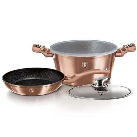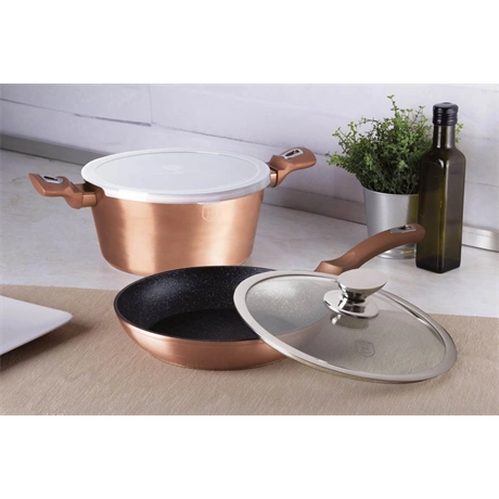 A készlet kovácsolt alumíniumból készült, amely biztosítja a tartósságot és a kiváló hővezetést. A szett tartalmaz egy O24*4,8 cm-es serpenyőt (1,7L), egy O24*11,8 cm-es lábast fedővel (4,1L), valamint egy műanyag fedelet. A rose gold szín eleganciát és modern megjelenést kölcsönöz a konyhának.
