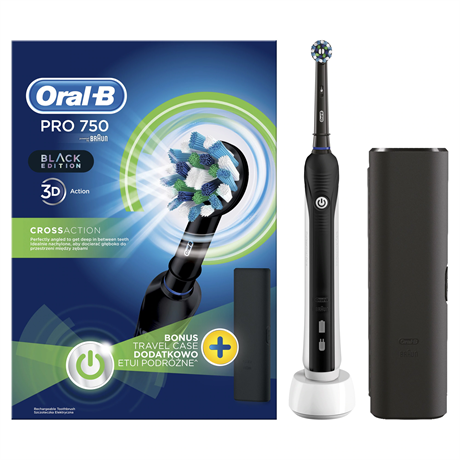 Az Oral-B PRO 750 elektromos fogkefe klinikailag igazoltan kimagaslóbb tisztítóhatást nyújt, mint az Oral-B manuális fogkefék. A professzionális fogászati eszközök ihlette Cross Action fogkefefej 16 fokban megdöntött sörtéivel körbeveszi a fogakat, miközben a 3D-s tisztító funkció rezgő, forgó és pulzáló mozgása akár kétszer több lepedéket lazít fel és távolít el, mint az Oral-B manuális fogkefék. A markolatba épített időmérő segít a fogorvosok által javasolt 2 perces fogmosási idő betartásában. A csomaghoz egy ajándék utazótok is tartozik. A következő pótfejekkel használható: CrossAction, 3D White, Sensitive Clean, Precision Clean, FlossAction, TriZone és Dual Clean.