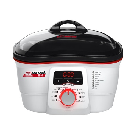 Főzőedény,1500 W teljesítmény, térfogat 4 liter, 10 féle főzési funkció, kivehető és mosogató gépben mosható alkatrészek, tapadásmentes felület, Tartozékok: üveg fedél, tortaforma, 2 féle rács, fondue készlet 6 villával, fritőz kosár, merőkanál,