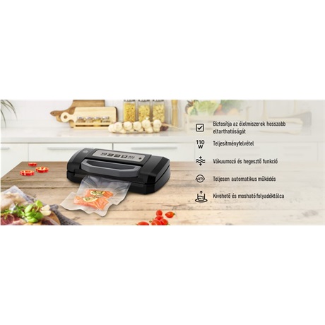 - Teljesen automatikus: kiszívja a levegőt és légmentesen lezárja a fóliát