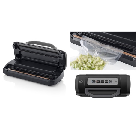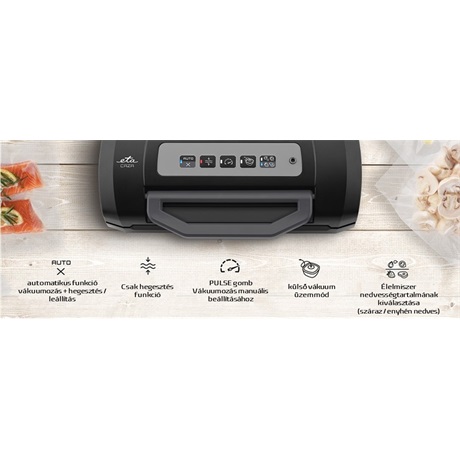 Az ETA Caza automatikus működésének köszönhetően, mindent megold Ön helyett. A funkció kiválasztása után a készülék először kiszívja a levegőt a fóliából, majd egyenletesen lezárja azt. Ezután kényelmesen tárolhatja a fóliázott élelmiszert a hűtőszekrényben vagy a fagyasztóban.