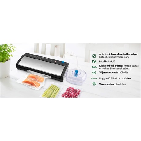 - Teljesen automatikus: keményen bezárja a fóliát, kiszívja a levegőt, varratot készít