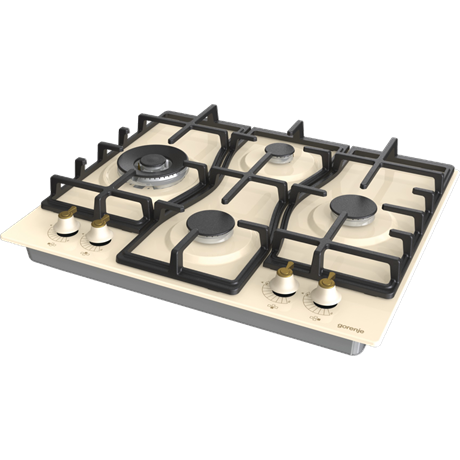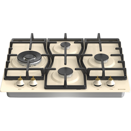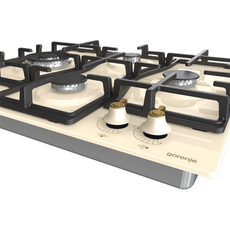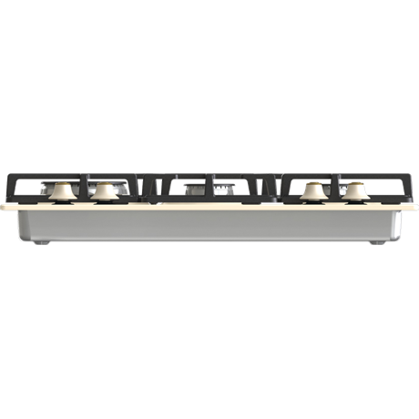 Classico design, 4 gázégő, 1 wok, egykezes szikragyújtás, öntöttvas edénytartó rács és égőfejek, kezelőszervek elöl, elefántcsont szín, égésbiztosító