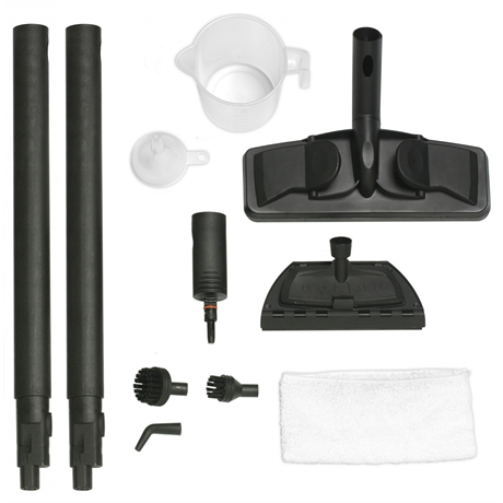 - Többfunkciós tartozékkészlettel: padlókefe, 2 hosszabbító cső, tisztító kendő, gőzfúvó, ívelt fúvóka, 2 kerek kefe, 2 az 1-ben kombinált ablaktörlő, mérőpohár és tölcsér