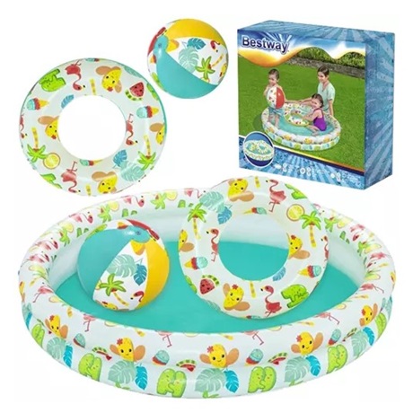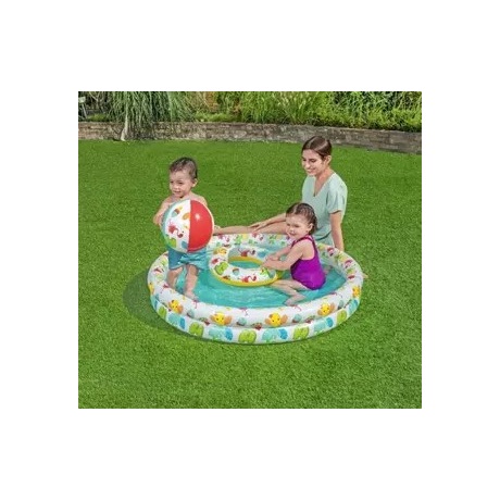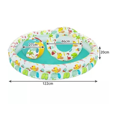 A víz örömeinek játékos felfedezéséhez készült gyermekmedence. Több gyermek számára is alkalmas, két gyűrűből álló, felfújható medence. A két egymástól független gyűrű kiváló stabilitást biztosít a talajon. További előnye, hogy nem kötelező mindkét gyűrűt felfújni, így kisebb gyermeke könnyebben tudnak ki és bejutni a medencébe. A szett részét képezi a medencén kívül egy 27 cm átmérőjű labda és az úszással még csak barátkozók részére készült 46 cm átmérőjű úszógumi.