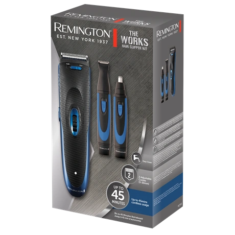 A Works hajvágó készlet mindent tartalmaz, amire szükséged lehet, hogy kifejezd egyéni stílusod, beleértve a hajvágót, az elemmel működő precíziós trimmelőt szakállfésűvel és az elemmel működő forgófejes orr- és fülszőrzet vágót. A hajvágó 2 db állítható vezetőfésűvel rendelkezik 18 hosszbeállítással (3 mm-15 mm és 18 mm-30 mm).