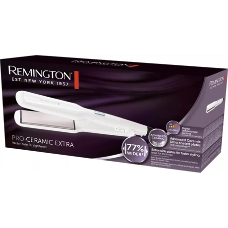 A Remington Pro-Ceramic Extra széles lapos hajsimítót 77%-kal szélesebb simítólapokkal* úgy tervezték, hogy több hajat fogjon át egyetlen áthúzással, a gyorsabb formázás és az egyenletesebb végeredmény érdekében. A 150-230 °C közötti 9 digitális hőmérséklet-beállítással pontosan a haj típusának megfelelő hőmérsékletet választhatod ki. A fejlett kerámia-ultra bevonatú simítólapok 75%-kal simábbak** a könnyed siklás és a ragyogóbb végeredmény érdekében. Hideg állapotból mindössze 15 másodperc alatt felmelegszik, így kevesebb időt kell várakozással töltened, és több időt fordíthatsz kedvenc frizurád elkészítésére.