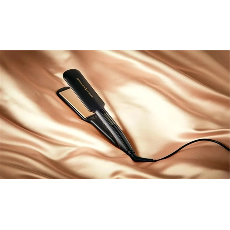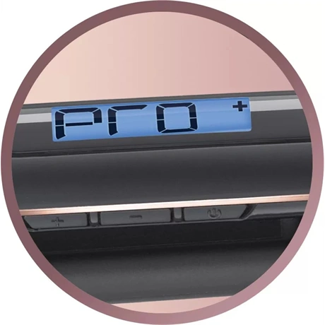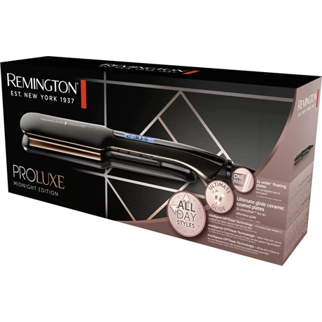 Élvezd az egész napon át tartó szalonminőségű frizurát a Remington PROluxe Midnight széles lapos hajsimítóval. A hosszabb 110 mm-es rugalmas lapok 2-szer szélesebbek^, mint a hagyományos hajsimítók, így egyetlen áthúzással több hajat fognak át, míg az 5-ször simább** Ultimate Glide kerámia bevonat könnyedén siklik a hajon, miközben minden egyes tincset kiegyenesít. Ez a lágy fekete kivitelű, rózsaarany színű elemekkel díszített, elegáns hajsimító ugyanolyan jól néz ki, mint amilyen eredményt nyújt. Az OPTIheat integrált hőérzékelők egyenletes hőt biztosítanak a haj optimális pontjain, hogy a haj reggeltől estig megőrizze szépségét. A 150-230 °C közötti 9 digitális hőmérséklet-beállítás lehetővé teszi, hogy kiválaszthasd a hajtípusodnak megfelelő hőfokot. Még praktikus PRO+ beállítást is választhatsz a haj kíméletesebb 185 °C-on történő formázásához. Legyen szó akár szálló hajszálak lesimításáról, gyengéd hullámok kialakításáról vagy tükörsima frizuráról, biztos lehetsz benne, hogy a Remington PROluxe Midnight széles lapos hajsimító segít neked a megfelelő frizura elkészítésében.