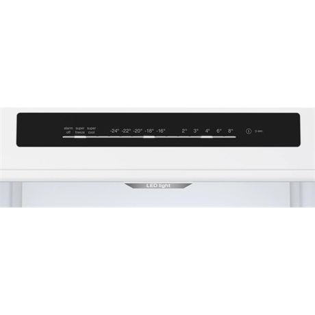 - Kezelő- és jelzőelemek típusa: Fagyasztó hőmérséklet kijelzése, Fagyasztó super fokozat, Fagyasztótér figyelmeztető, Hangjelzés: ajtó nyitva, Hangjelzés hiba esetén, Hűtő hőmérséklet kijelzése, Hűtő super fokozat