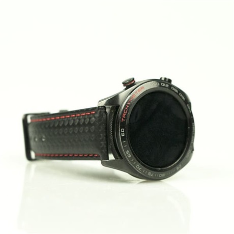 Kiváló minőségű bőrszíj karbonszálas mintával és gyönyörű, polírozott fekete csattal. Elegáns és vonzó viselet az okosórádhoz ha az alkalom úgy kívánja.