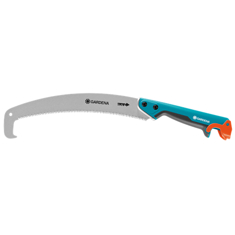 A 340 mm-es fűrészlappal ellátott, ívelt GARDENA combisystem kerti fűrész rugalmasan használható a különböző jellegű munkákhoz. A könnyen elérhető ágak fűrészeléséhez használja a kerti fűrészt „normál” kézifűrészként. A fűrész nyele jól fekszik a kézben, mert kényelmes, lágy műanyag elemekkel ellátott, ergonómikus kialakítású. Magasabban fekvő ágak esetén, akár 5 méteres magasságig egyszerűen hosszabbítsa meg a nyelét, használja a combisystem teleszkóprudat. Praktikus: egyszerűen rögzítse a combisystem nyelet a fűrészhez. A biztosító zár garantálja, hogy a kapcsolat stabil marad. A biztonságos vágás érdekében impulzus-edzett foghegyekkel és háromszoros csiszolattal rendelkezik. Az ívelt combisystem kerti fűrész 300 P korrózió ellen ideális védelmet nyújtó speciális bevonattal készül. A nyél visszahajló kialakítása megakadályozza, hogy lecsússzon a keze még húzó mozdulatnál is. A levágott ágak könnyen lehúzhatók az ívelt fűrészlap végén lévő tépőkampóval. A szerszám akasztólyukkal és biztonságos tárolást lehetővé tevő élvédővel van ellátva. Így a fűrész mindig biztonságosan tárolható. A szavatossági idő 25 év.
