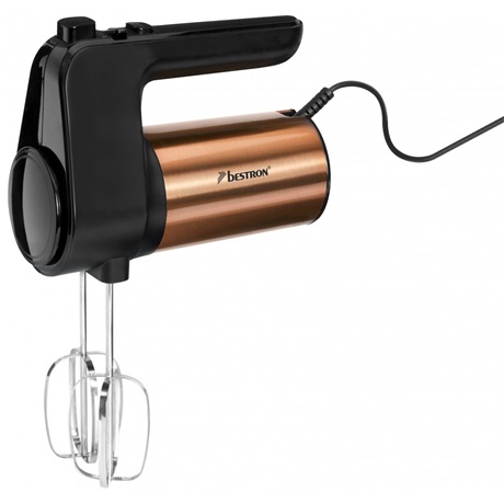 KÉZI MIXER – 6 sebesség beállítás turbó funkcióval – Biztonsági kioldógomb – Rozsdamentes acél tartozék: 2 habverő és 2 dagasztó kar – A keverőfejek mosogatógépben moshatók – 400W teljesítmény – Stílusos réz/fekete kivitel