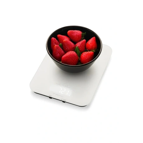 A TARE funkcióval egyszerűen levonhatja a tál súlyát, vagy fokozatosan adhat hozzá hozzávalókat. A mérleg térfogatot is mér – például víz és tej esetén is. Az áttekinthető LED kijelző, a két gombos egyszerű kezelés és a többféle mértékegység közötti választás kényelmes és sokoldalú eszközzé teszi a konyhában.