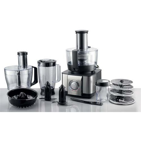 Tartozékok – felszerelés: Citrusprés, Kávédaráló, Tészta dagasztó feltét, Finom daráló lemez, Finom reszelő lemez, Spatula, Reszelő lemez, Vékonyra szeletelő lemez, Durva daráló lemez, Vastagra szeletelő lemez