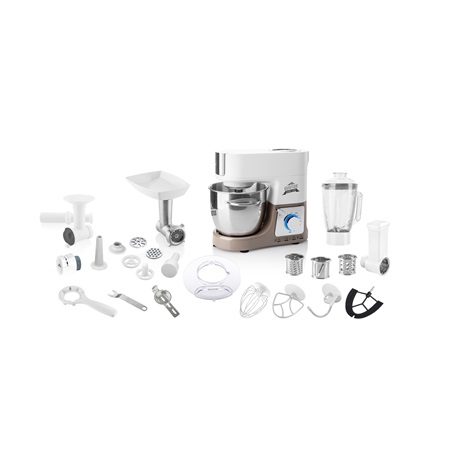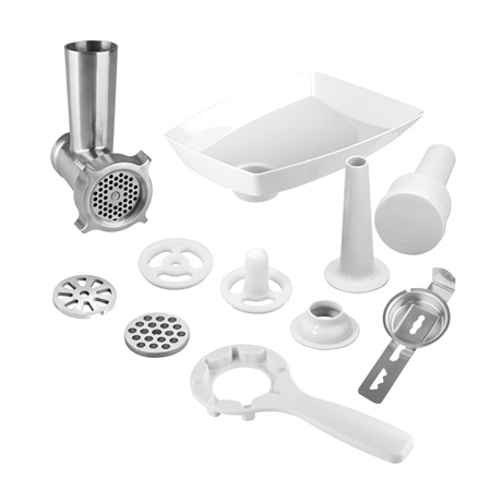 - Hús daráló (átmérő 54 mm) (3x reszelő lap a közepes, durva reszeléshez és nagyon durva daráláshoz, tartozék a hentesáru töltéséhez , kebbe mellékletet, sütemény készítő, beöntő, töltő eszköz, kioldó kulcs)