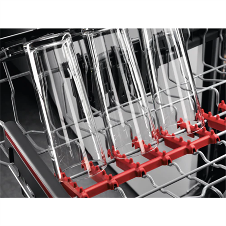 Felső kosár opciók: 2 borospohár rögzítő gumigyűrű, 2 db pohárrögzítő gumitüske sor, lehajtható pohártartók, Műanyag fogantyú