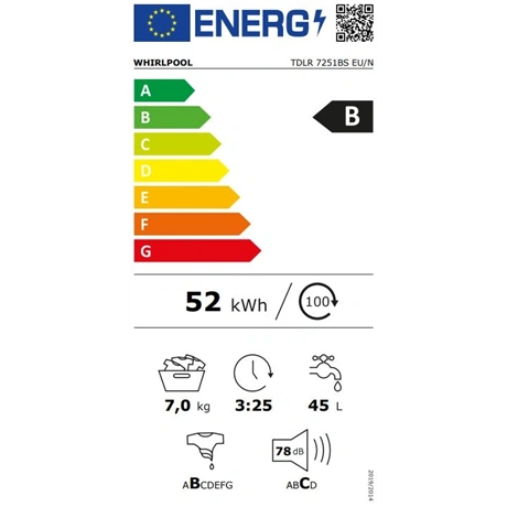 Kiváló energiahatékonyság. Ez a Whirlpool mosógép kiemelkedő, B osztályú energiahatékonysági besorolással rendelkezik.
