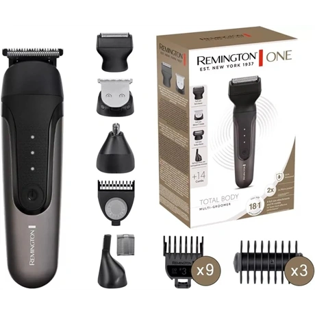 A Remington ONE Total Body 18in1 multifunkciós szőrtelenítő négy erőteljes, teljes méretű tartozékkal rendelkezik: A rezgőkéses borotvával 3-szor gyorsabban érhetsz el tisztára borotvált eredményt**, a 38 mm-es T-vágókéses trimmelő 20%-kal szélesebb***, így magabiztosan nyírhatod a szakálladat, a testszőrzetvágót kifejezetten a test egészének kényelmes trimmelésére tervezték, a precíziós kialakítású, lineáris orr-, fül- és szemöldökvágó pedig mikrovágóéllel rendelkezik, amely megszabadít a bosszantó kóbor szőrszálaktól a kellemetlen helyeken is. 100%-ban vízálló, így zuhanyzás közben is használható, praktikus, ha időt szeretnél megtakarítani a szőrtelenítési rutin során. A gyors töltésű, vezeték nélküli Remington ONE Total Body 18in1 multifunkciós szőrtelenítő mindent tartalmaz, amire szükséged lehet ahhoz, hogy otthon vagy útközben is gondoskodhass stílusodról, beleértve az USB-töltést és a praktikus tárolótáskát. A ONE az egyetlen, amire szükséged van.