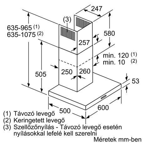 – Méretek légkivezetéses üzemmódban (Magasság x Szélesség x