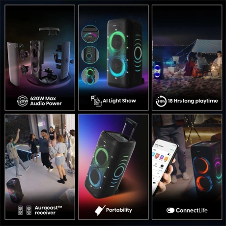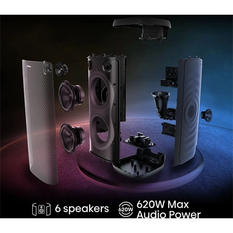 Engedd szabadjára az ütemet a 620 W maximális hangteljesítménnyel. Csak hangosabban, hagyd, hogy a ritmus átvegye az irányítást. A hat nagy teljesítményű hangszóróval felszerelt rendszer minden irányba gazdag, rétegzett hangzást vetít. A nagyobb hangzás két teljes tartományú hangszóróból származik, míg a kettős magas- és mélysugárzók a mély basszusokat és az éles magas hangokat biztosítják, amelyekre az igazi rajongók vágynak.