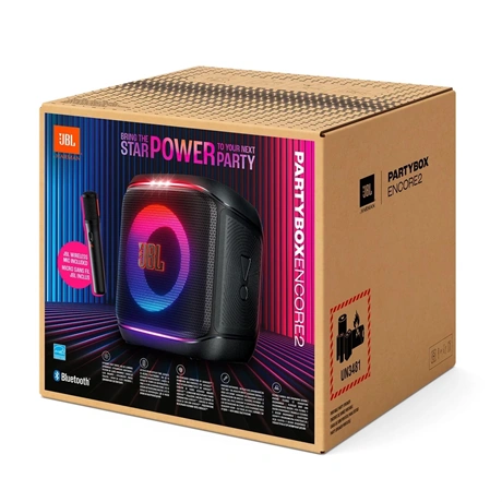 A JBL Partybox Encore 2 újrahasznosított műanyagot és újrahasznosított szövetet tartalmaz. A csomagolása szójatintával nyomtatott FSC-tanúsított doboz.