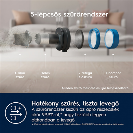 Szűrési hatékonyság, teljes tisztító (%). Szabvány: EN 60312-21-2017: 99.9