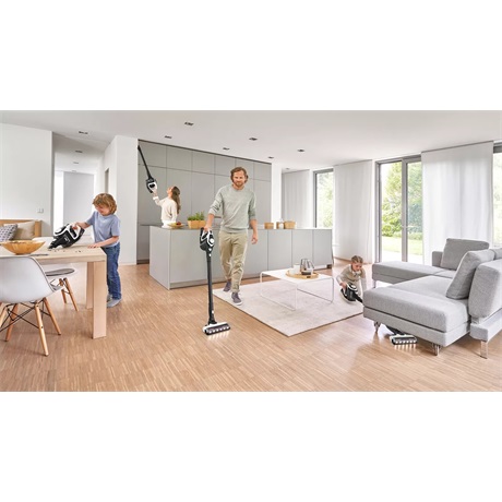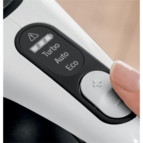 A különböző porszívózási feladatokhoz különböző módok szükségesek. A „Turbo” növeli a nehéz feladatok teljesítményét azáltal, hogy annyi energiát biztosít, mint egy vezetékes porszívó *. Az „Auto” beállítja a teljesítményt és a futási időt a felülettől függően. Az „Eco” pedig rendkívül hosszú, optimális futási időt biztosít a mindennapi takarítási feladatokhoz.