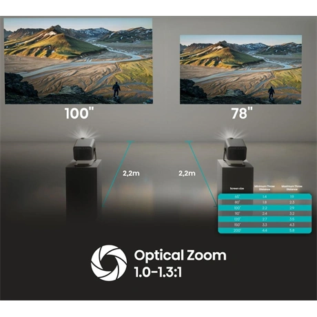 Közelíts vagy távolíts anélkül, hogy a kép élessége vagy tisztasága romlana. Az 1.0-1.3 vetítési arányú, rugalmas zoom mindig 4K minőségben tartja a képet, bármilyen közelről nézed is.