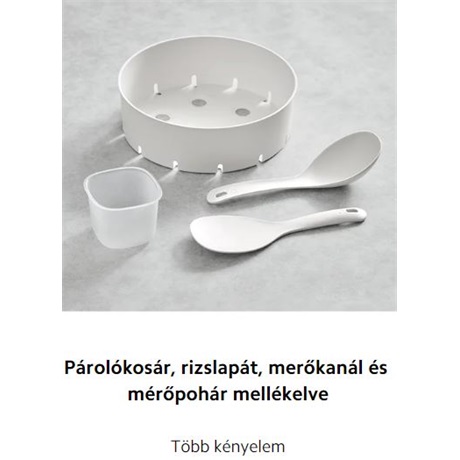 Párolókosár, rizslapát, merőkanál és mérőpohár mellékelve