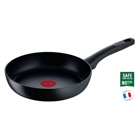 Magas hőmérsékleten történő főzés, abrazív tisztítás … A valódi főzés a hosszantartó terhelésnek ellenálló, valódi főzőedényt igényel. A Tefal társaság szilárdan hisz az ásványok hatékonyságában, ezért minden szaktudásunkat felhasználtuk a Mineralia+ tapadásmentes felület tökéletesítésénél a Black Stone sütő serpenyő hosszú élettartama érdekében. Ez a kitűnő sütő serpenyő rendkívül kemény anyagok hozzáadásával és egyedi szerkezettel készül annak érdekében, hogy akár az olyan intenzív igénybevételnek is megfeleljen, mint a rántott garnéla sütés, cukkini sütés és rántott húsok sütése, amelyek mindig zamatosra és puhára sülnek, kívül pedig finom ropogósak. A Tefal saját exkluzív technológiáját alkalmazza a tartós főzőedények gyártásához: A Thermo-Signal™ hőmérséklet-jelző tökéletes sütést biztosít, amelynek köszönhetően a főzés rendkívül biztonságos, a továbbfejlesztett Thermo-Fusion™+ technológia pedig biztosítja az egyenletesen átsült ételeket. A Tefalnál a legnagyobb gondossággal készült konyhai edényeket gyártunk, már 60 éve. Társaságunkat már a kezdetektől az állandó innovációs vágy és a tökéletes, biztonságos és kiváló teljesítményű termékek alkotása iránti vágy vezérli kompromisszumok nélküli minőséggel. Ugyanakkor rendkívül fontosnak tartjuk a környezet védelmét és ezen belül a hulladékok mennyiségének a csökkentését. A termékek garantáltan PFOA-, ólom- és kadmium mentesek, és a francia szakmai ismeretek teljes mértékű felhasználásával készülnek.