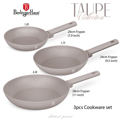 A 3 részes serpenyő szett a Taupe Collection része, amely tökéletes választás mindazok számára, akik szeretik a stílusos és praktikus konyhai eszközöket. Ez a szett nemcsak a főzés élményét emeli új szintre, hanem a konyhád megjelenését is feldobja. A szett tartalma három különböző méretű serpenyő, amelyek mindegyike kovácsolt alumíniumból készült, tapadásmentes titánPro bevonattal.