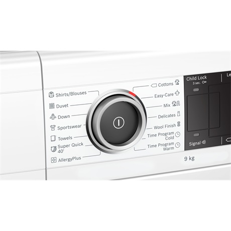 Speciális programok: allergia plusz, pamut, blúz/ing szárítás, tolltöltetű anyagok, finom anyagok, törölköző szárítás, mix, szuper 40 perc, sportruha szárítás, paplan, szintetikus anyagok, gyapjú, időprogram (hideg), időprogram (meleg)