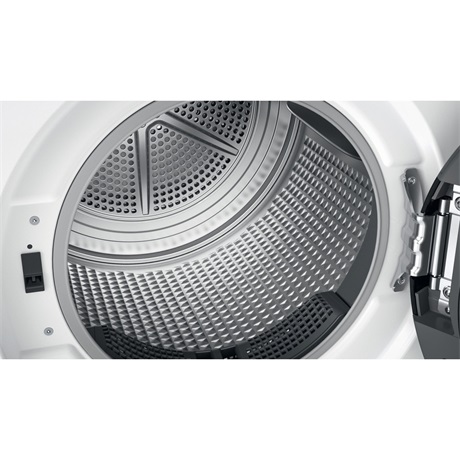 Hőszivattyús szárítógép, „A+++” energiaosztály, 8 kg (pamut) szárítási kapacitás, nagy digitális kijelző, BPM motor, 6. Érzék funkció, fehér gép, fekete ajtó fekete kerettel.