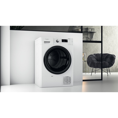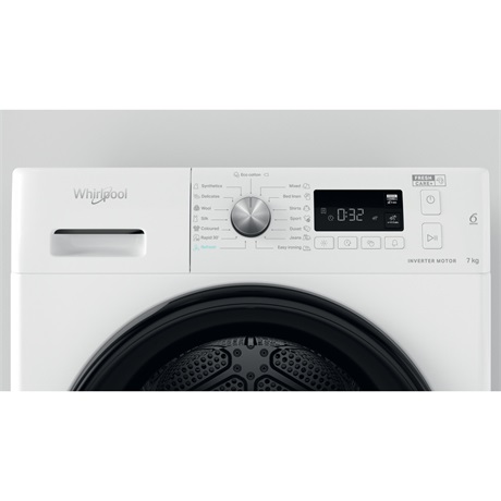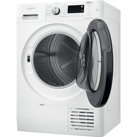 Hőszivattyús szárítógép, „A++” energiaosztály, 7 kg (pamut) szárítási kapacitás, kis digitális kijelző, BPM motor, 6. Érzék funkció, fehér gép, fekete ajtó fekete kerettel.
