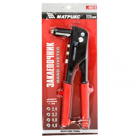 A szerszám szerkezeti acélból készül. A készlet tartalmaz négy különböző fejet különböző átmérőjű szegecsekhez és cserekulcsot. Alumínium szegecsek rögzítésére tervezték.