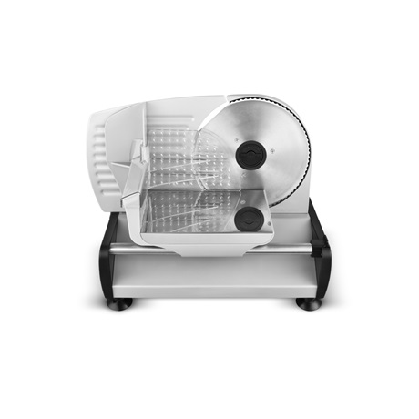 Tökéletes kenyér, hús, sajt, szalámi, kolbász és még sok más szeletelésére Csúszásmentes lábak a stabilitás érdekében A támasztóasztal, a kézvédő és a biztonsági kapcsoló biztonságos felhasználást biztosít Biztonsági zár a kés cseréjéhez, vagy tisztításához Levehető vágókorong, rozsdamentes acélból Adagolólap rozsdamentes acél Alumínium ház Penge átmérője: 19 cm Állítható vágási vastagság: 0-15 mm Az átlátszó élelmiszer-tartó vágásvédelmet biztosít 1db extra penge, finom szeleteléshez Teljesítmény: 150 W Zajszint: < 76 dB