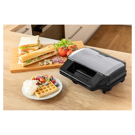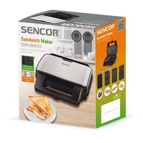 A Sencor SSM 9940SS szendvicssütő 4 az 1-ben funkciójának köszönhetően ideális választás, ha gyorsan szeretne egyszerű harapnivalókat készíteni. A négy különböző cserélhető sütőfelületen készíthet háromszög alakú melegszendvicset, gofrit vagy akár grillezhet rajta húst is. A Teflon, tapadásmentes felülete révén könnyen tisztítható és nem ég oda az étel.
