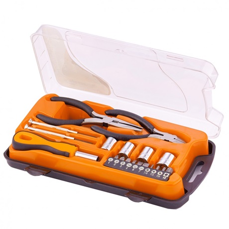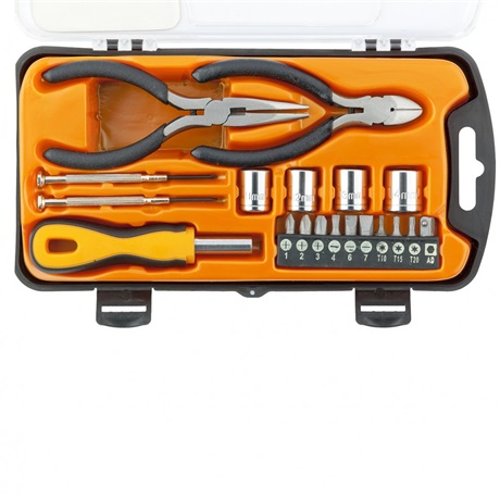 A készlet tartalmaz csavarhúzókat a precíziós munkákhoz, csavarhúzót bitekhez, bitekhez és dugaszolófejekhez a rögzítők felszereléséhez/leszereléséhez, oldalvágókat és hosszú orrú fogót a vezetékek és apró alkatrészek megfogásához, tartásához és vágásához.