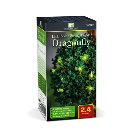25 db szitakötőből álló napelemes lámpa szett, amely varázslatos hangulatot teremt bármely kertben. A kis szitakötőket melegfehér LED-ek világítják meg, ezzel teremtve kellemes hangulatot. A nap folyamán a szolár panel a napfényt elektromos árammá alakítja és feltölti a beépített akkumulátort. Szürkületkor a termék automatikusan bekapcsol, napfelkeltekor pedig ki. Ideális lehet bármilyen kertben, bokrok, fák, virágoskertek egyedi és különleges dekorálására.