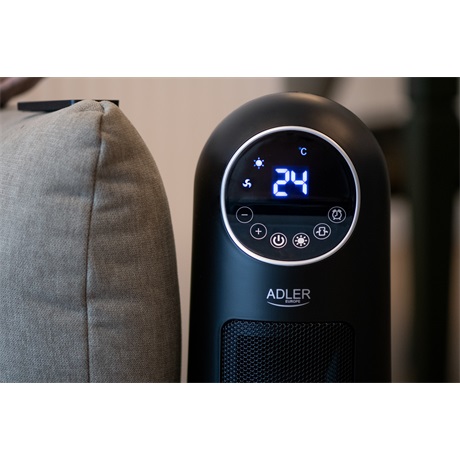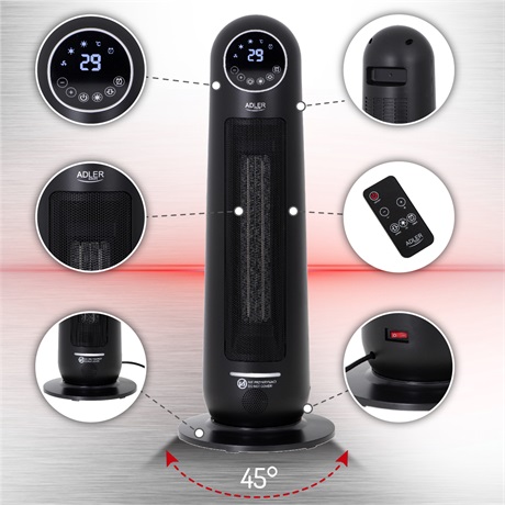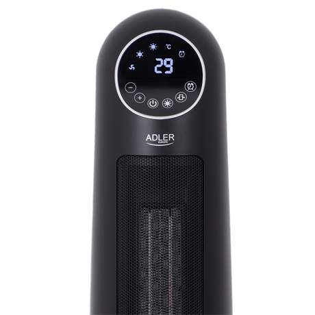 Ventilátor fűtés hatékony kerámia fűtővel, LCD kijelzővel és távirányítóval. A beépített termosztát automatikusan fenntartja a kívánt hőmérsékletet a helyiségben, a készülék szükség szerinti be- és kikapcsolásával. A készülék időzítővel rendelkezik, amely lehetővé teszi a munkaidő 1-8 óra közötti beállítását. Az LCD kijelző a 10-49 ° C közötti hőmérsékletet jelzi, a kiválasztott funkciók aktiválása. A ventilátoros fűtés 1200 W vagy 2200 W teljesítményű, vízszintes lengési funkcióval rendelkezik a 70 ° -os tartományban, biztonsági kapcsolóval, amely automatikusan lekapcsolja az áramellátást a készülék felborulása esetén, túlmelegedés elleni védelemmel és fogantyúval a hordozhatóság érdekében. A készülék távirányítóval van felszerelve.