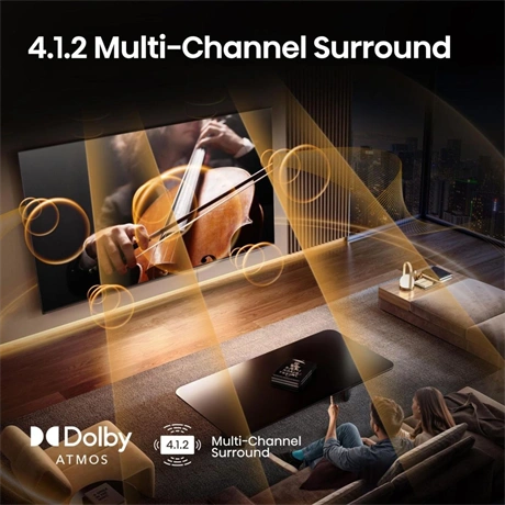 Az oldalsó hangszórók, a hátsó mélynyomók ??és a felfelé sugárzó hangszórók 4.1.2 többcsatornás élményt nyújtanak. Élvezd a mély basszust felülről és mindenhonnan, mindezt bonyolult beállítások nélkül. Csak tiszta, magával ragadó hangzás, tökéletes harmóniában a vizuális élményekkel.