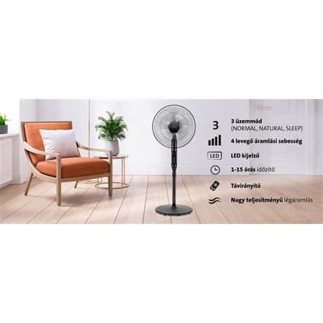 Az 1-15 órás időzítő funkció az egyes üzemmódokkal kombinálva is aktiválható. A beállított idő letelte után a ventilátor automatikusan kikapcsol.